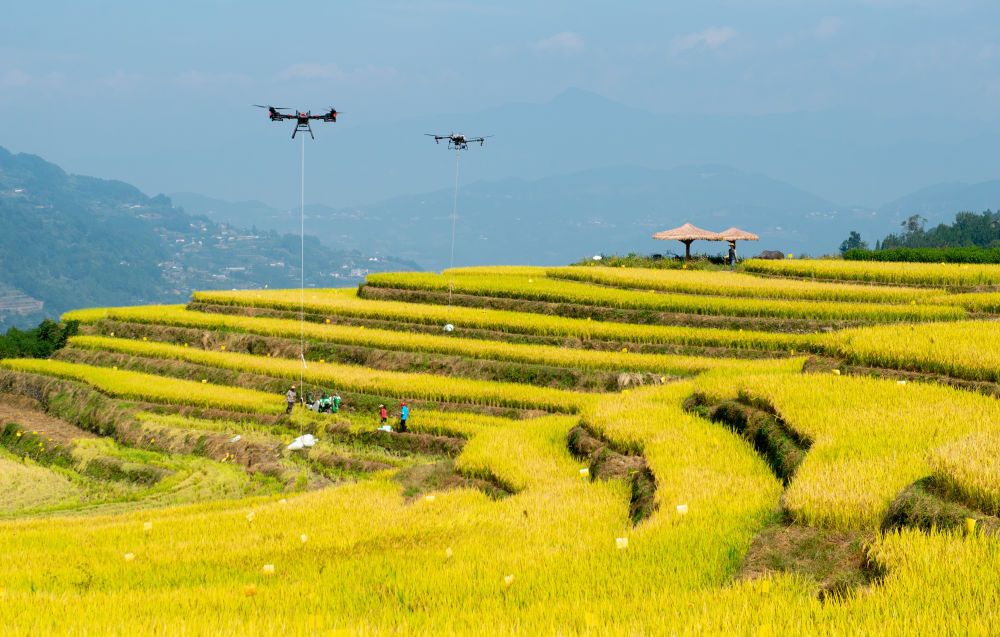 10月10日,湖北省秭归县沙镇西镇长春村村民使用无人机运输收获的水稻(无人机照片)。新华社发(雷勇供图)